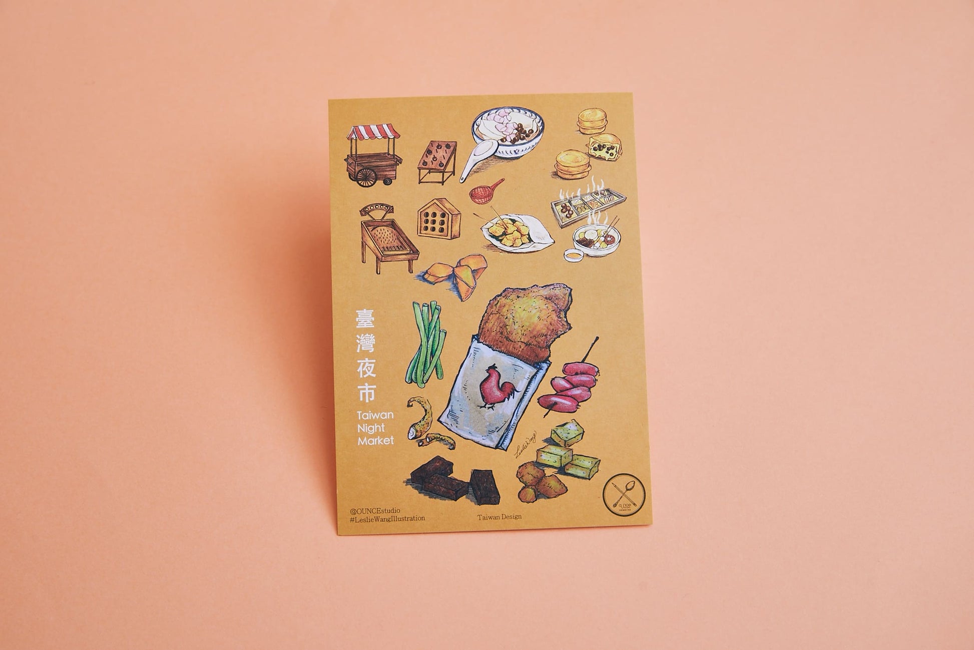 台湾の伝統的な朝食やお店がデザインされた、はがき。